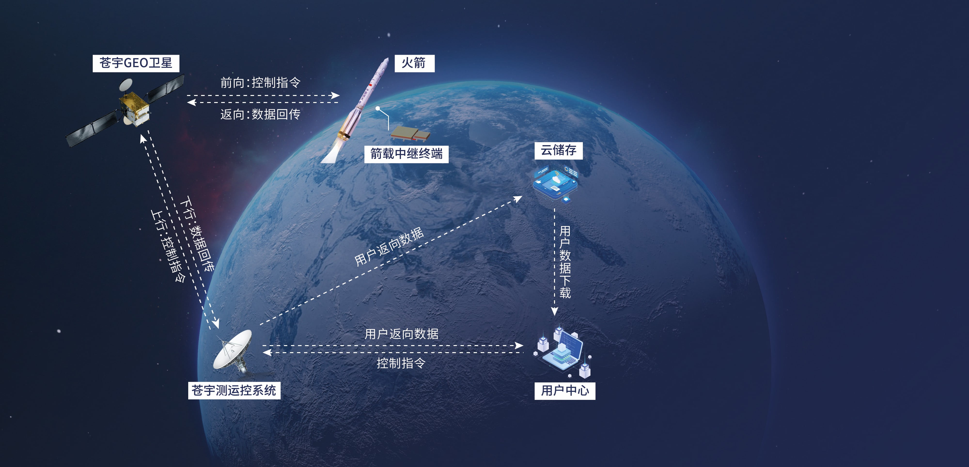 苍宇天基信息服务系统为火箭发射提供测控和数据传输的服务,根据不同的数据传输需求,用户可选择返向传输峰值速率分别为1Mbps和5Mbps的箭载相控阵终端,服务系统可为地基测控提供有效补充并与其形成天地基一体化的测控数传服务网络,同时可依据客户需求提供定制化服务。